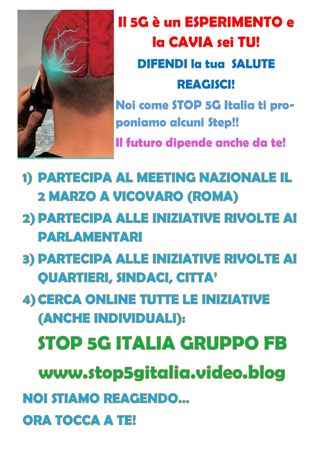 2)SCRIVI LE TUE PROPOSTE PER IL MEETING Fai sentire le tue ragioni, anche tu puoi e devi essere protagonista nel 1° meeting nazionale #Stop 5G – Emergenza politica di precauzione. Scrivi le tue proposte, sintetizzale in 15 righe e mandale per email all’indirizzo stop5gitalia@libero.it oppure postale direttamente in bacheca sul gruppo Facebook Stop5G ITALIA, scrivendo nell’intestazione LA MIA PROPOSTA PER IL MEETING #STOP5G. Tutte le proposte verranno raccolte in un unico file e poi girate a parlamentari e politici che interverranno a Vicovaro (Roma) nell’incontro del 2 Marzo 2019.